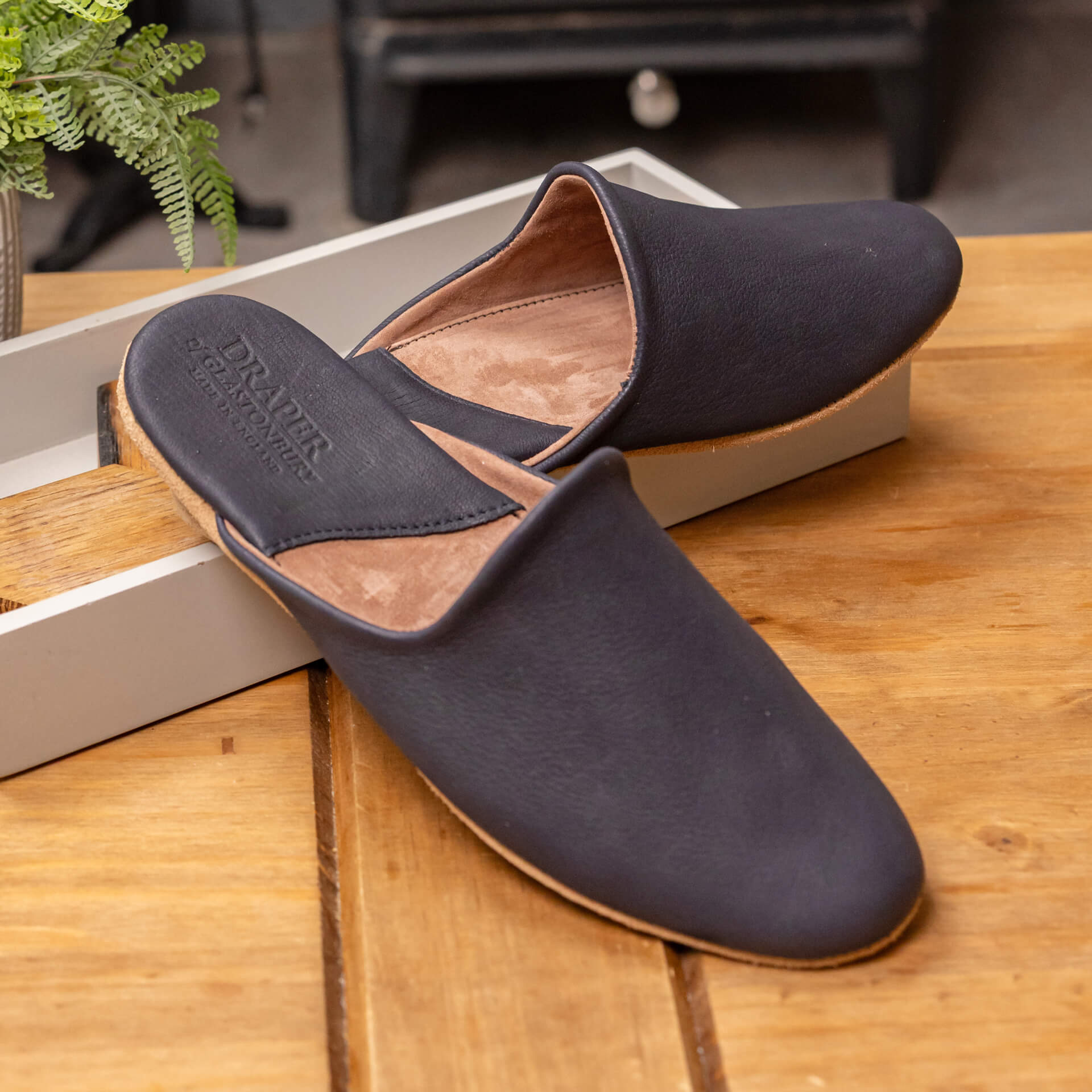 Our new men's premium leather mule slipper. Made with a Scottish Highland deerskin upper, leather lining and suede sole. Extra soft, extra comfortable, very lightweight slipper. Made in England.