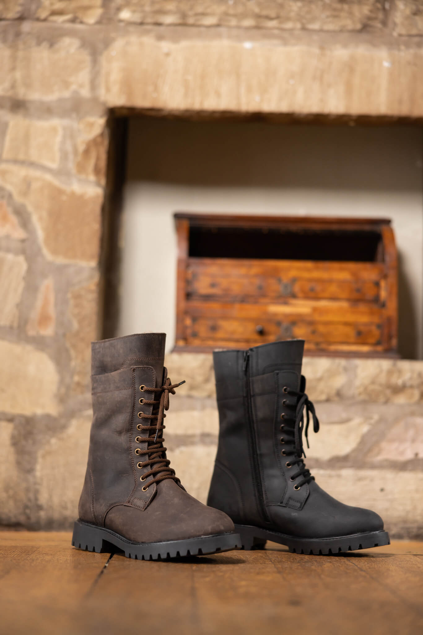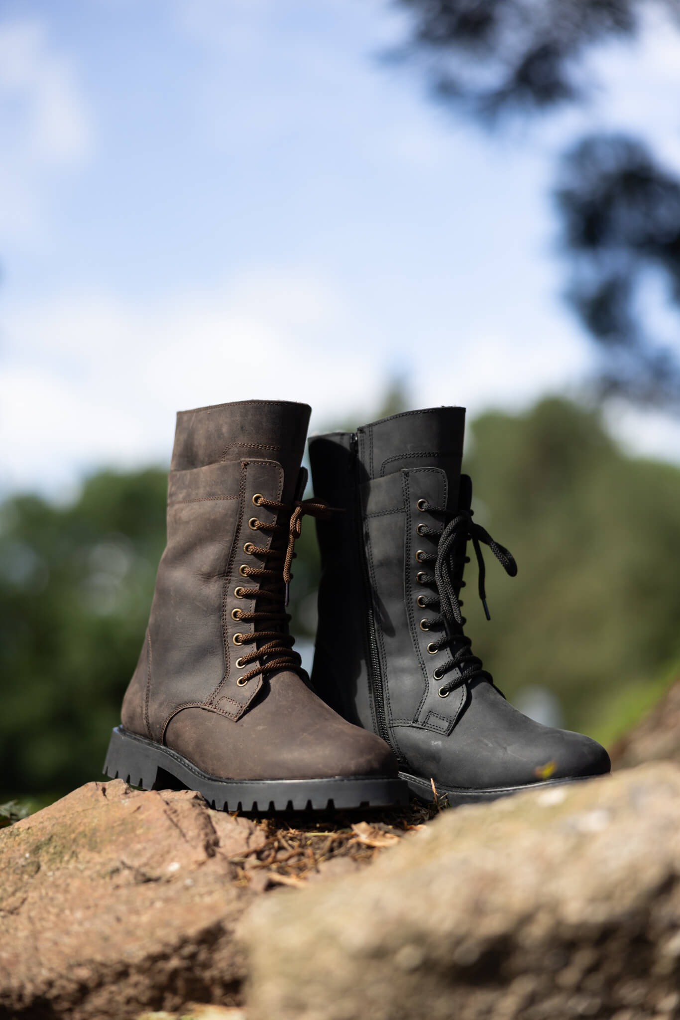 Our NEW calf height lace up boot. With our signature sheepskin lining from top to toe, including the insole, a durable non slip rubber sole and a waterproof waxed leather upper for practicality. It has an inside zip as well as laces at the front, to ensure the perfect fitting.
