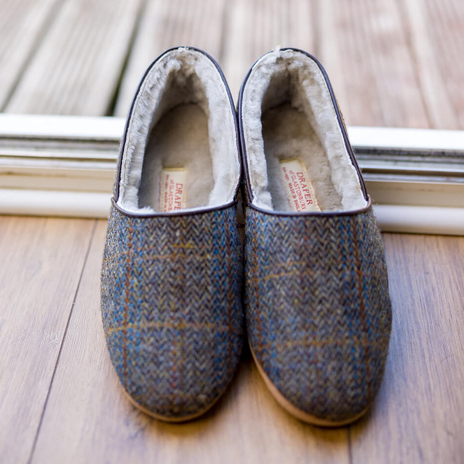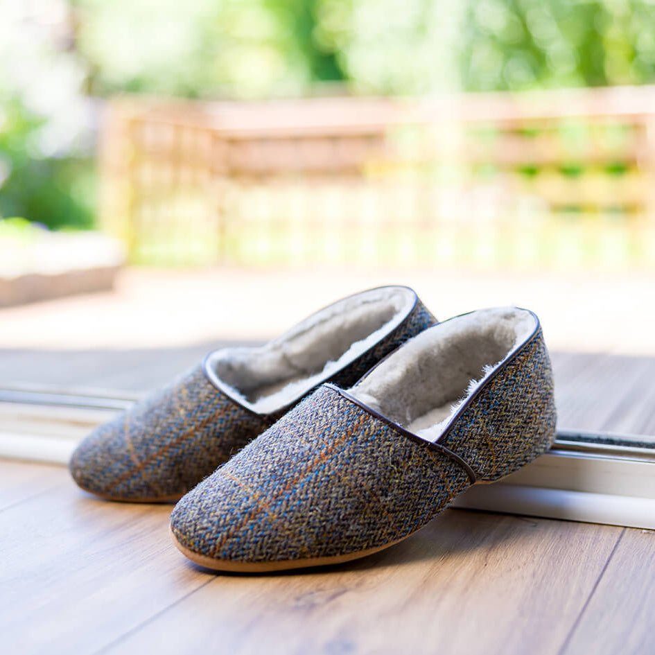 Treat your feet to classic style and exceptional comfort with the Lewis Men’s Harris Tweed Sheepskin Slippers — a standout choice for men who appreciate heritage, quality, and everyday luxury. Lovingly handcrafted to the highest standards in England by a fourth‑generation family business, these slippers reflect over 85 years of slipper‑making expertise rooted right here in Glastonbury.