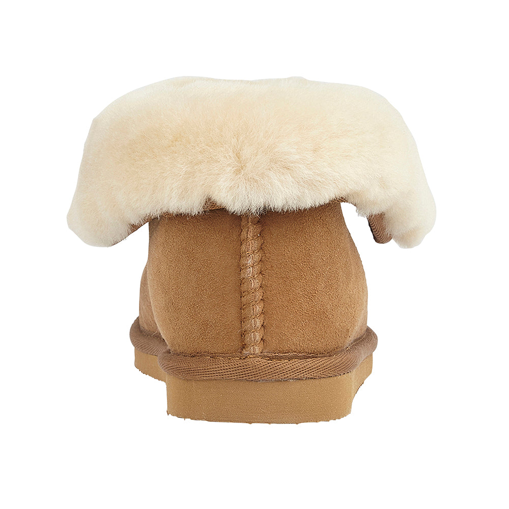 A luxury 'turn up the collar' real sheepskin slipper for women. Made with a premium quality double-faced sheepskin upper, with a collar that folds up over the ankles, or can be left down too. It has a lace that goes around the back of the slipper and can be tied up at the front, which allows you to adjust and tighten the fitting around your foot. It has sheepskin lining throughout the slipper, down to the toes, including the insole. It has a durable rubber sole for indoor and outdoor use, that is both flexible and lightweight.
