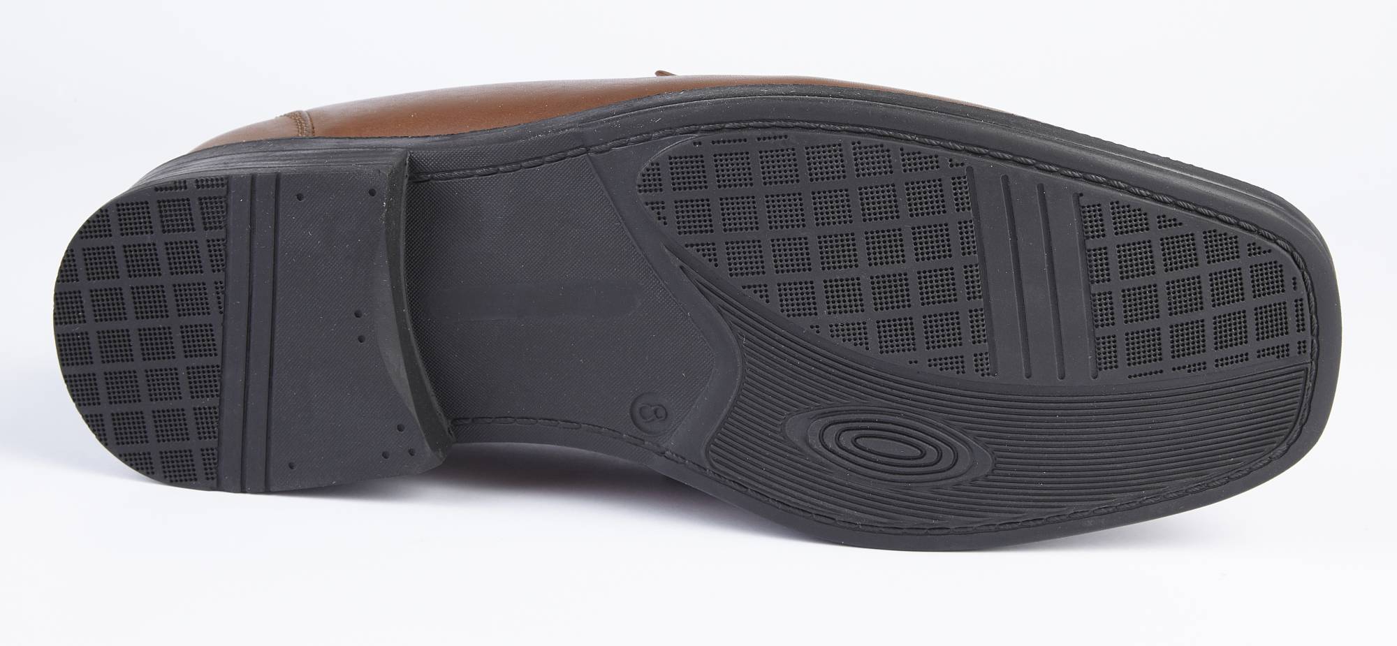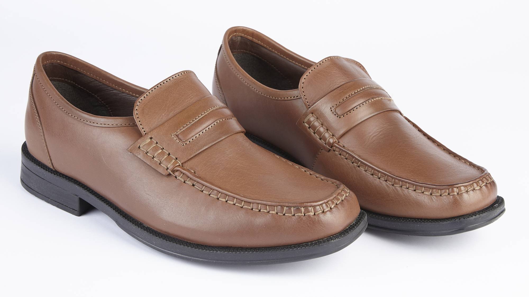Our men's loafer, with a soft leather upper, soft leather lining, and cushioned leather insole. It has plenty of room at the toe area, and a rubber sole with a one inch heel. It is an H fitting shoe (wider than regular)